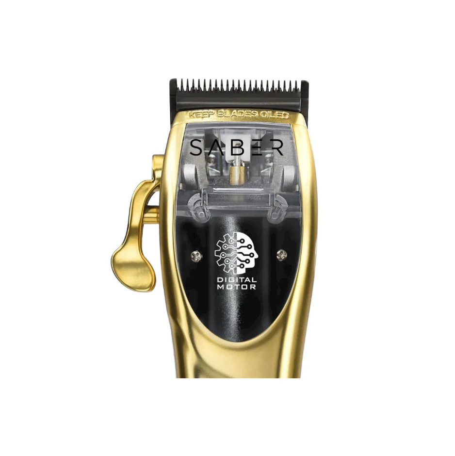 De volledig metalen behuizing in matgoud geeft de Saber een luxe uitstraling en zorgt tegelijkertijd voor maximale duurzaamheid. Met de afneembare transparante kap krijgt de tondeuse een unieke open look waarbij de motor zichtbaar wordt.